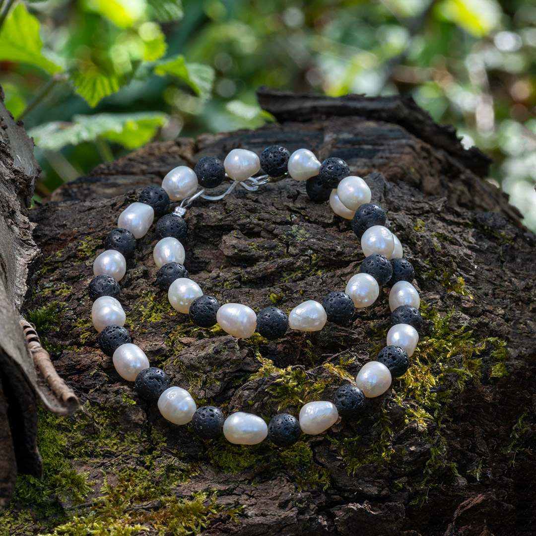 Kette mit weissen Süsswasserperlen und Lavasteinen.